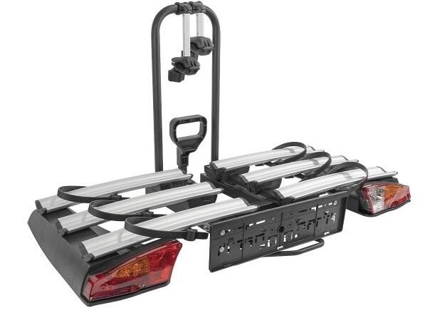 Portabici da gancio traino richiudibile con telaio in acciaio e larghi profili portaruota in alluminio.